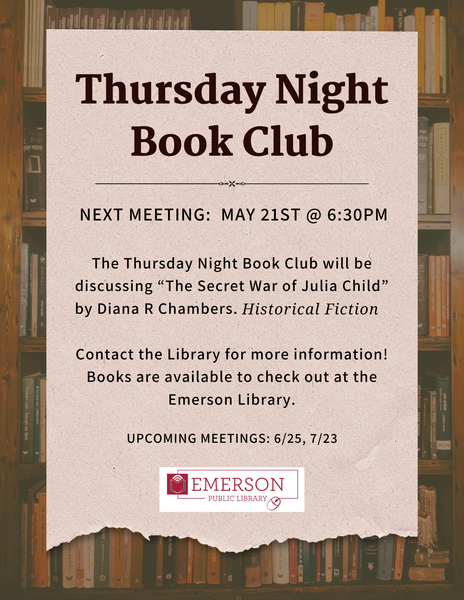 The Thursday Night Book Club will be discussing “The Secret War of Julia Child” by Diana R. Chambers. Historical Fiction.